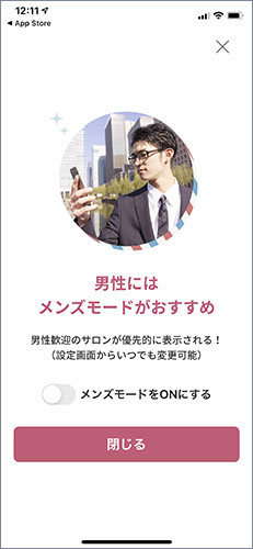 自分のスマホのOSに応じてダウンロードを行います。アプリを起動すると、アプリの簡単な説明があり、最後の項目として「メンズモードがおすすめ」というものもありました。