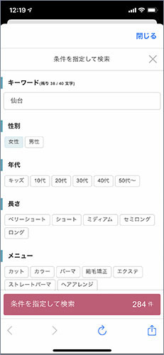 *仙台・宮城のサロンを探す場合には、キーワード検索欄に地名を入れてあげるのがオススメです。地名を入れないと、東京のお店が多かったので、お店探しの場合にはひと工夫が必要でした。