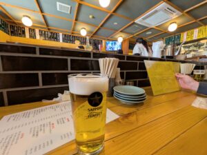 一軒目だし、まずは生ビールから。銘柄はサッポロ黒ラベル。一人で乾杯🍻