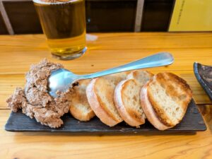 「レバーペースト」 バゲット4枚と、レバーペーストがたっぷり。どんどんビールが進む一品。