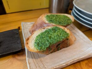 「ガーリックトースト」 これまた美味しいんです。厚切りのバゲットに、ガーリックソースがたっぷり。これに、レバーペーストを塗って食べるのが最高の組み合わせです♪