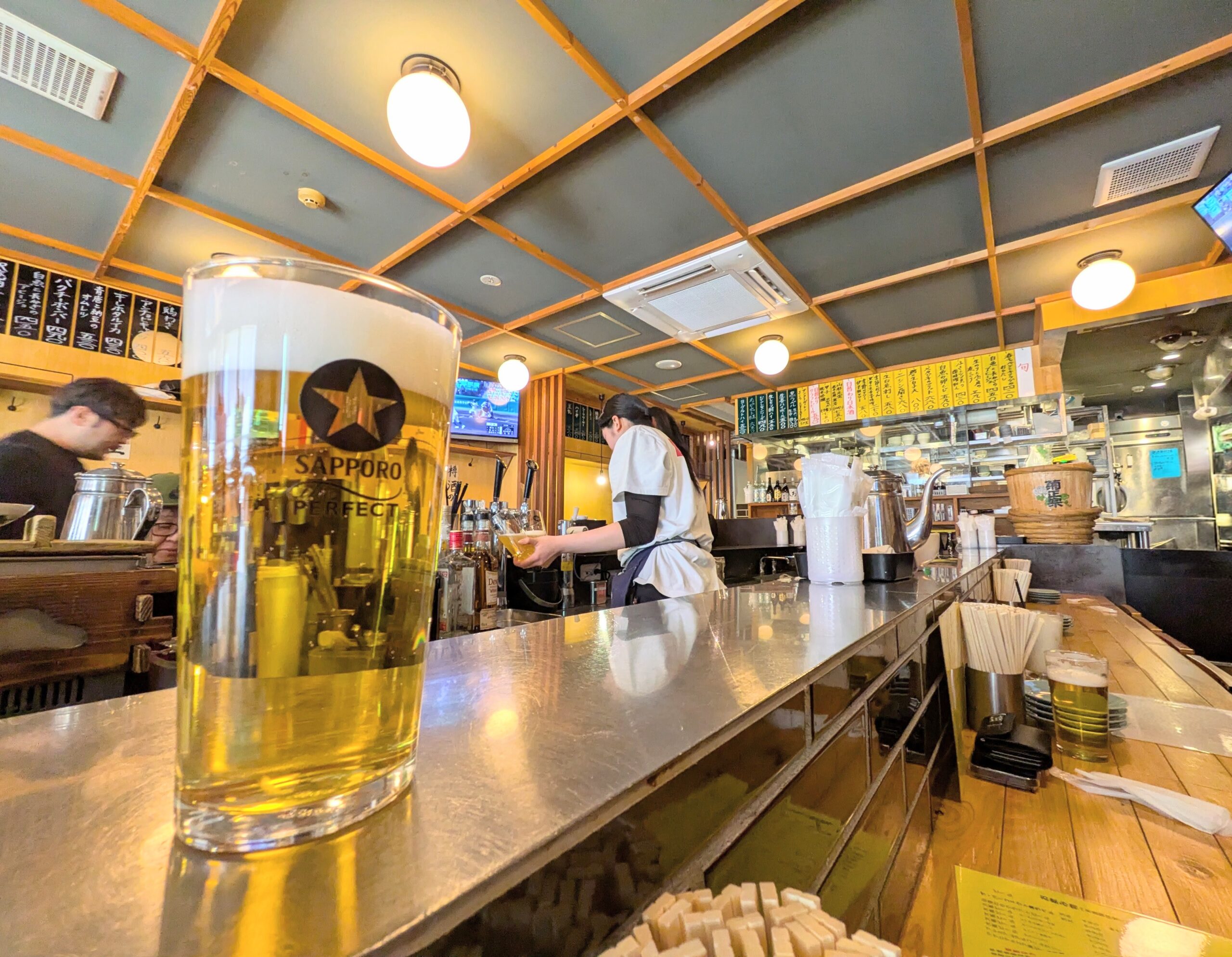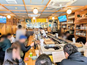 「大衆酒場BEETLE 仙台」さんです。土曜日の開店直後、14時10分頃の到着でしたが、既に店内は多くのお客さんで賑わっていました。コの字カウンターに数席空きがあったので、待ち無く入店。