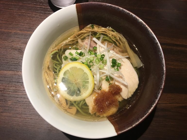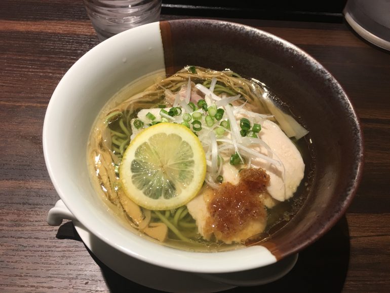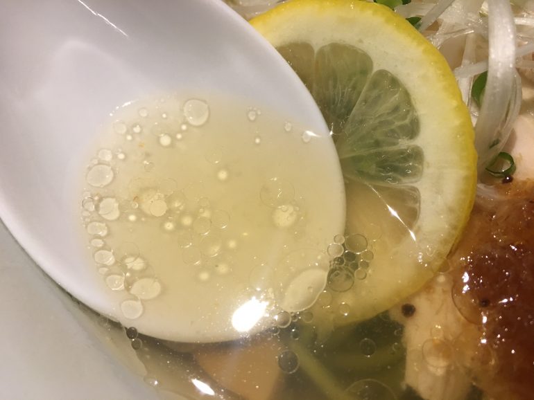 ビジュアルは最高。透明なスープに麺の緑、レモンの黄色と海老ソースの赤色と芸術的。なんとも美しいラーメンだ。