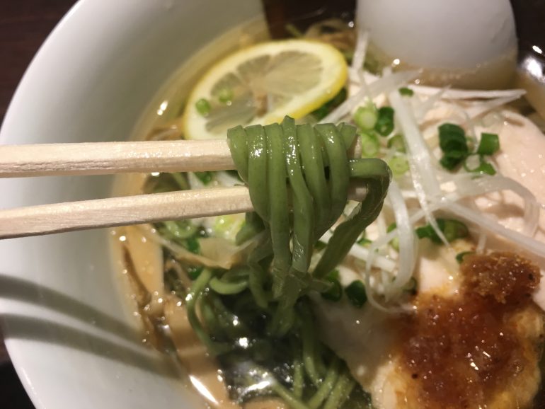 麺は自家製でストレートパッツンの清楚系。ほうれん草を練りこんでいて緑色、そこは無化調の自家製麺、健康志向系ラーメンを謳うだけの事はある。ただやはりほうれん草の味であったり香りであったりを盛り込むのは難しいらしく、食べる分にはただの緑色の麺である。