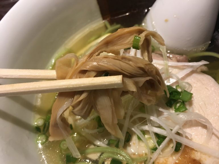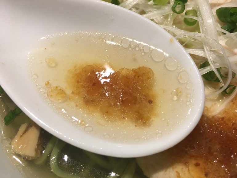 透き通ってキラキラ輝くスープは塩気が強め、思った以上にあっさりとしていてこれは好みが分かれる味かもしれない。