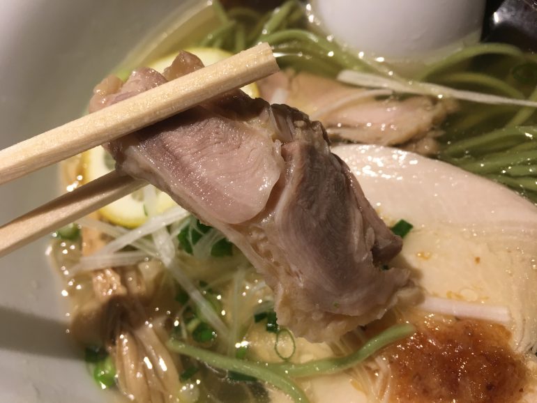 チャーシューは鶏の2種類。食感が異なっていてこれは面白い。低温調理の柔らかな食感と親鶏のコリコリした食感、2つ同時に味わえるのは贅沢だ。