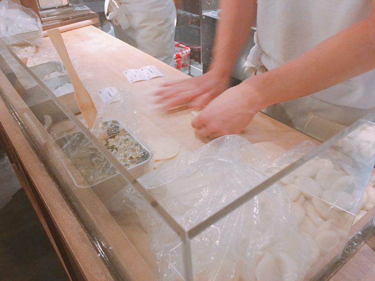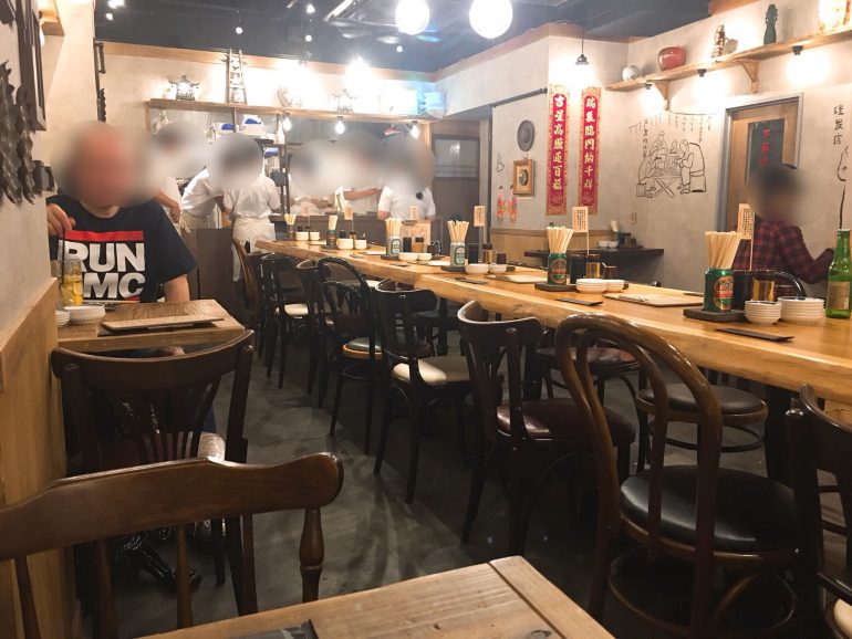 説明された通り、餃子は注文してからの手作り。入り口すぐ横が厨房なので見ながらの飲食も可能。皮を伸ばしたり餡を詰めたり、流れるような作業を見ているのは面白い。ただ店内との仕切り板が低くて神経質な人はちょっと気になるかもしれない。