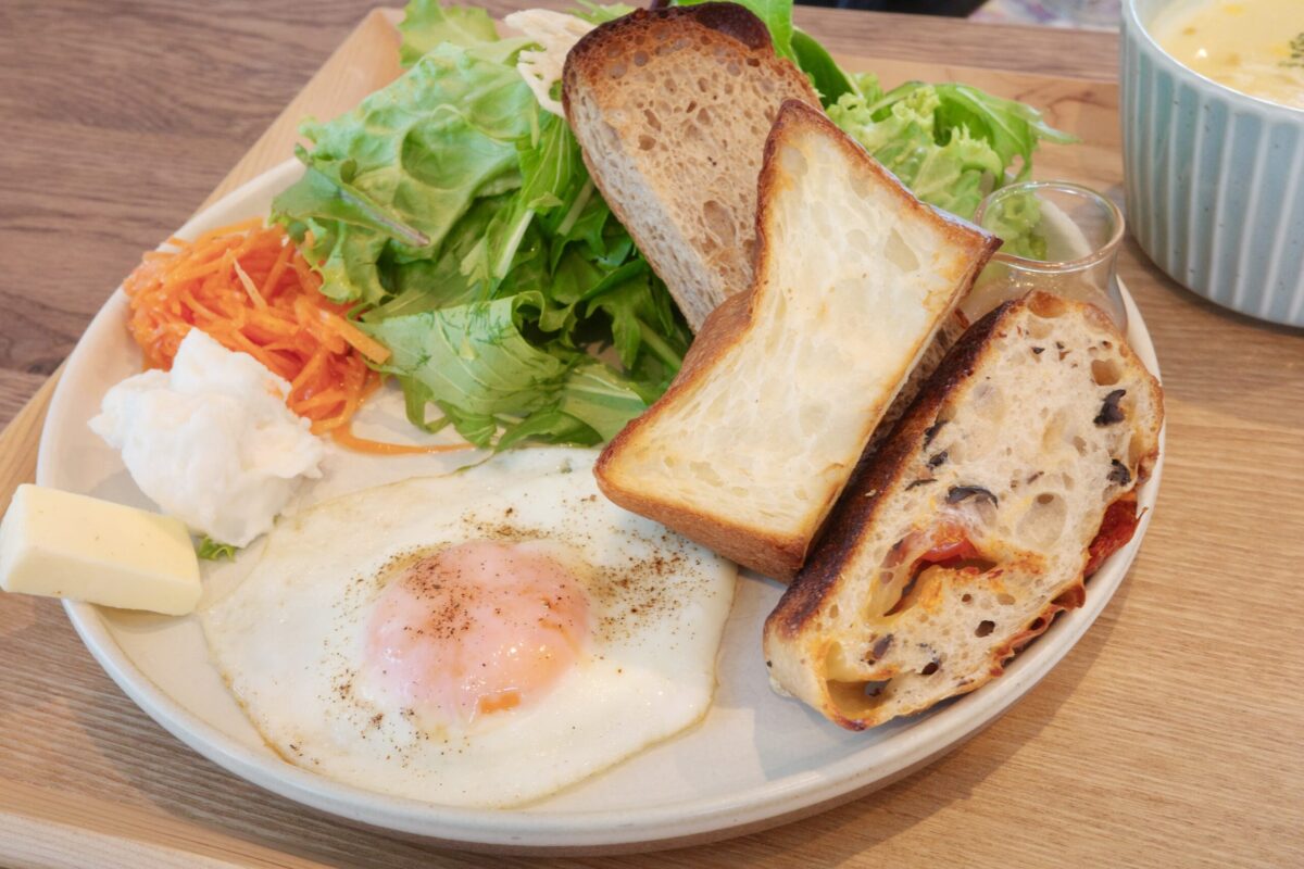 目玉焼きやサラダ、デリも添えられていてバランスよく楽しめます。