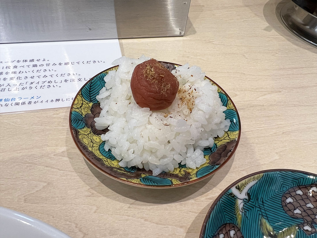ラーメンと一緒にダイブめしと味変用のレモンが付いてきました。お皿が可愛い♬