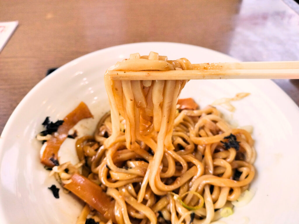 麺は結構太くて柔らかめです。中華麺よりもうどんに近いような麺で、プリンプリンで食べ応えがあって美味しいです。