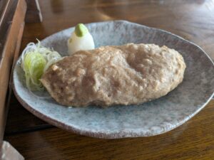 これは、そばがき を揚げたものです。外はカリっと、中はふんわり。優しい味で蕎麦の風味を楽しめます。