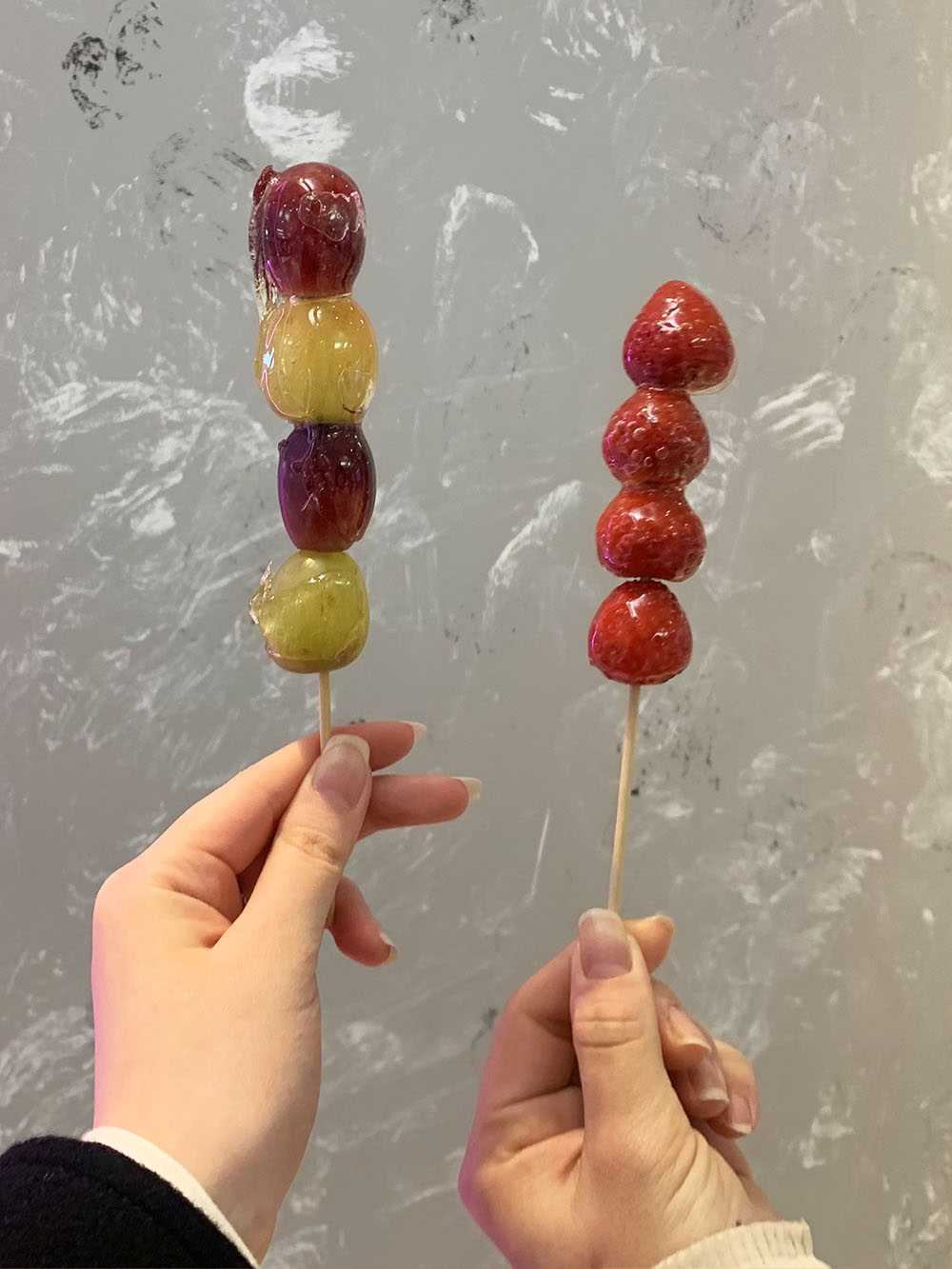 ショッピングの合間の休憩に甘いフルーツ飴はいかがですか。私たちはイチゴ飴とブドウ飴を食べて、幸せな気分になりました!