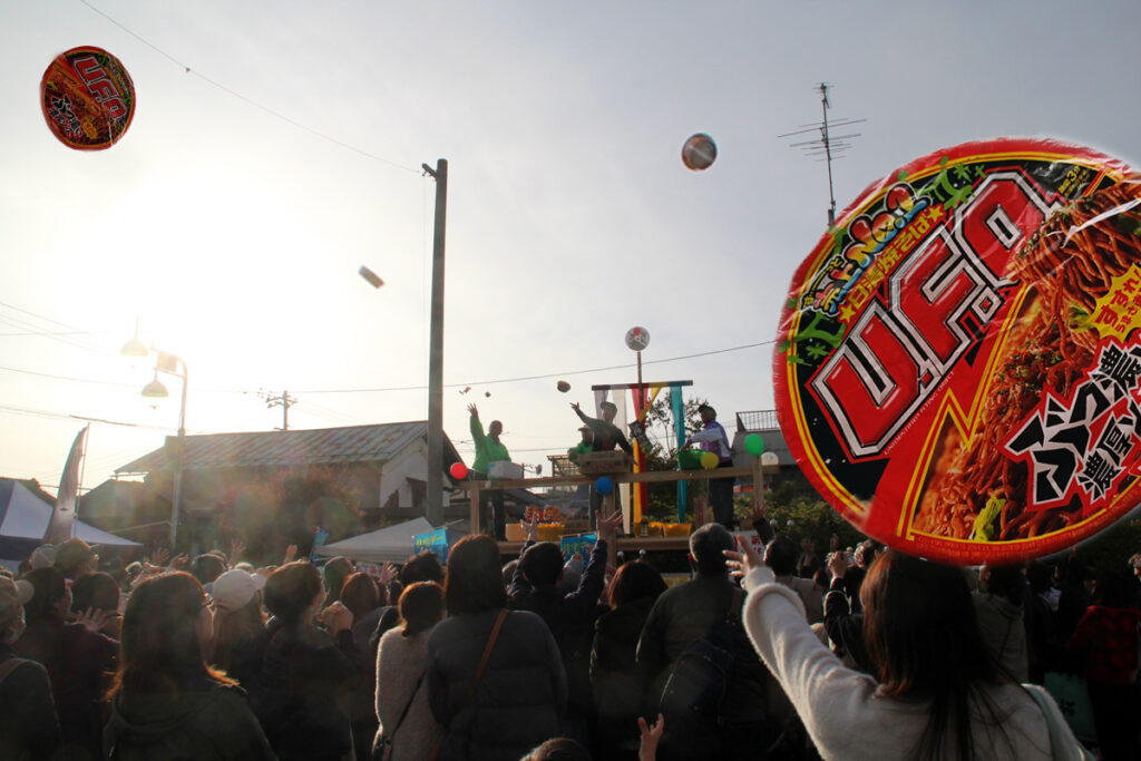 イベントの最後は、模擬上棟式(建前)で餅やお菓子、みかんがふるまわれ、やきそばUFOも空を舞った。
