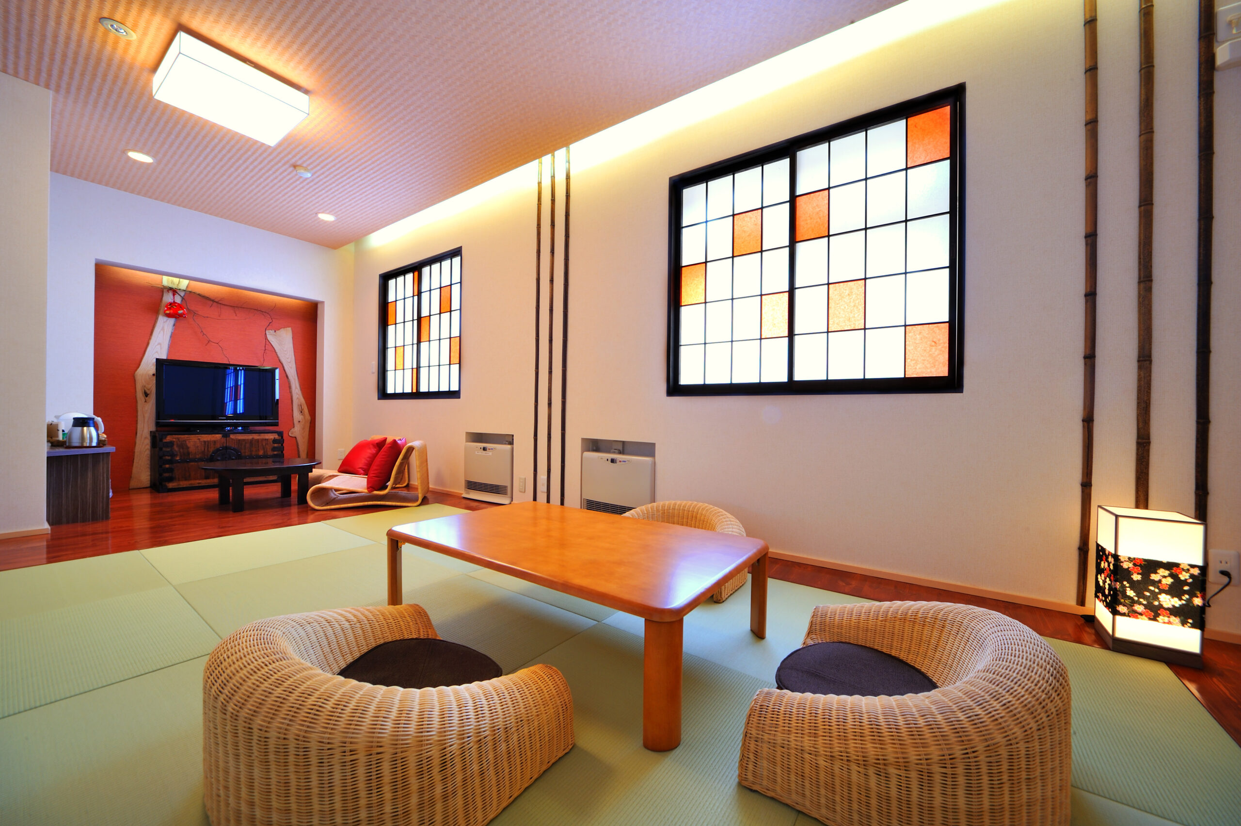 琉球畳や古タンスのアクセントが可愛らしいお部屋。夜は間接照明で落ち着いた雰囲気に、朝は朝日が差し込む明るい雰囲気として。普段とはまた違った、ゆっくりとした過ごし方ができそうです♪
