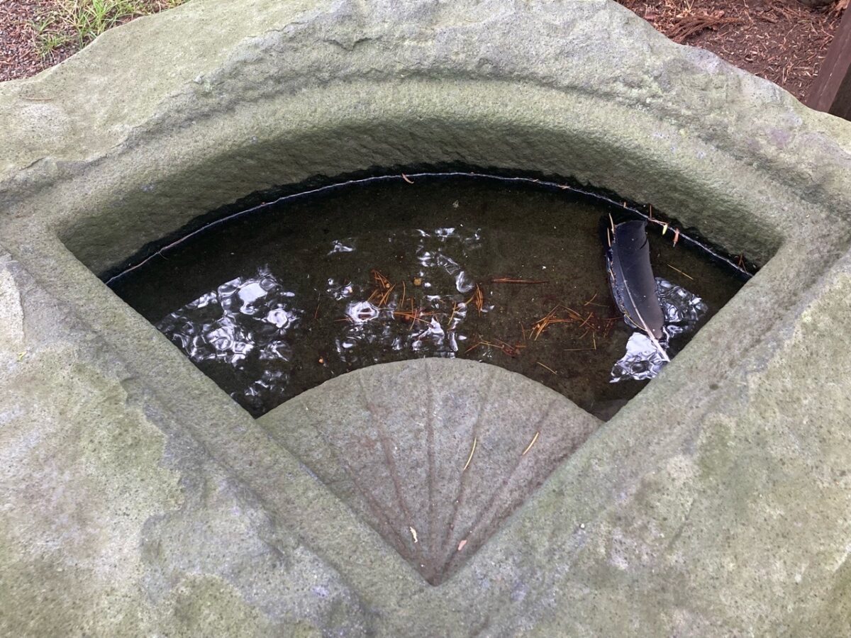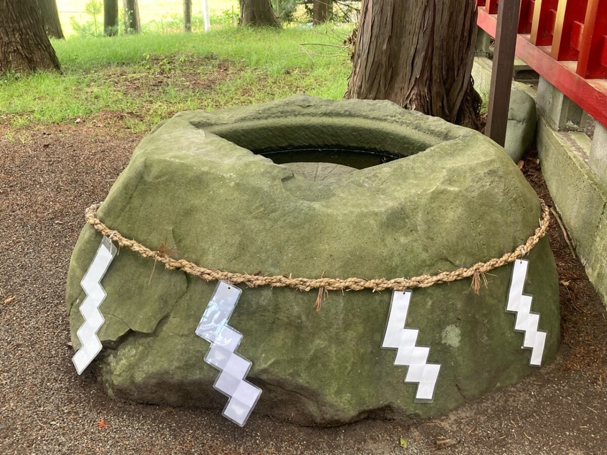 境内には、八幡神社などの境内社のほか、扇型の水盤が彫られた手水鉢(ちょうずばち)「御神石(ごしんせき)」がありました。