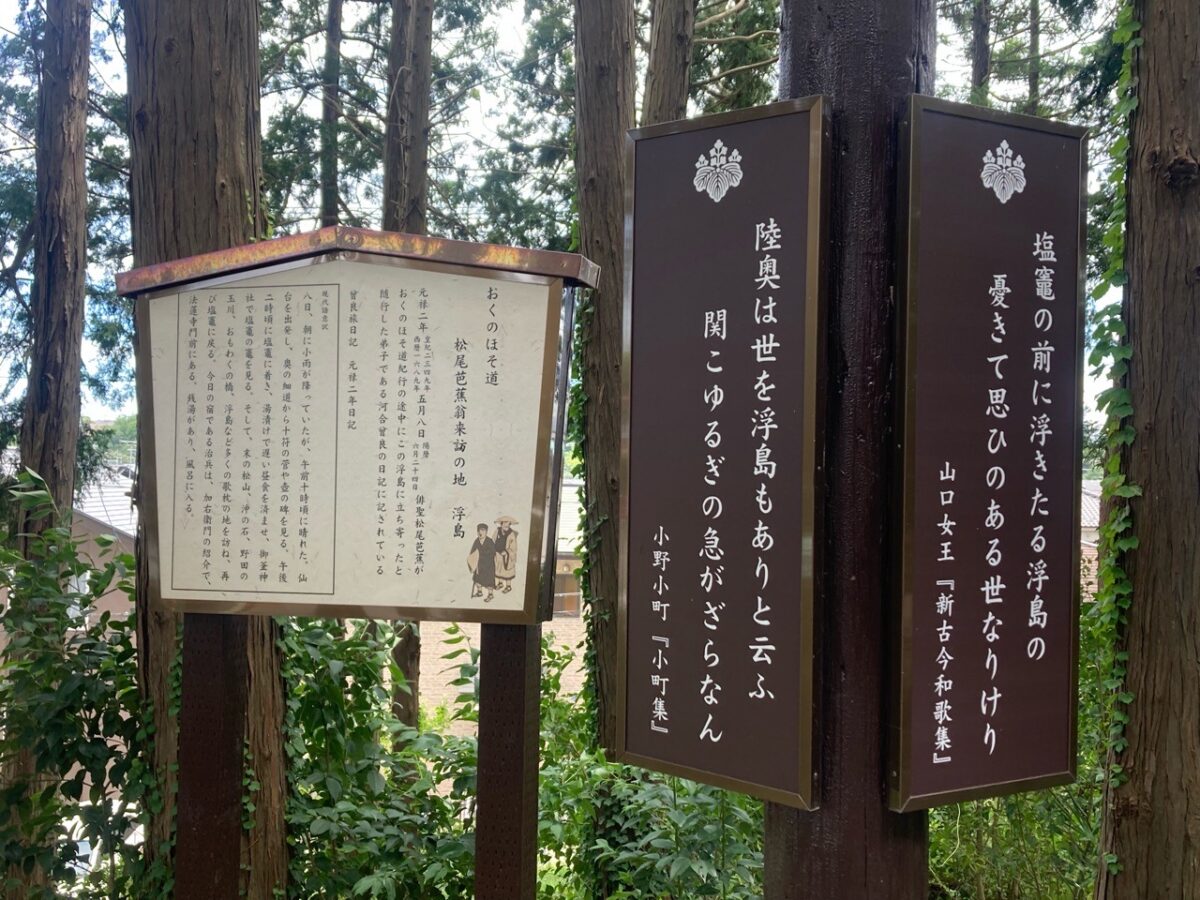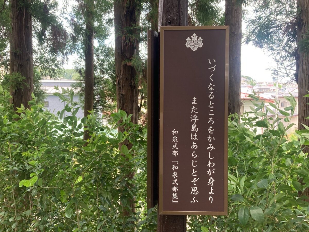 社殿向かって右手には、「歌枕浮島参道」という、歌枕「浮島」を詠んだ和歌をしたためた看板が連なる道があります。