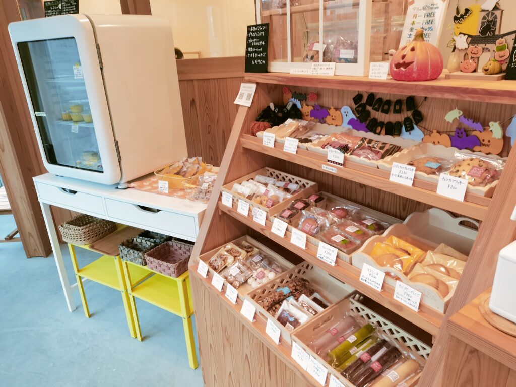 店内はハロウィン仕様でした!焼き菓子も飾り付けも可愛い!!木製の棚が温かみがあっていいですね。