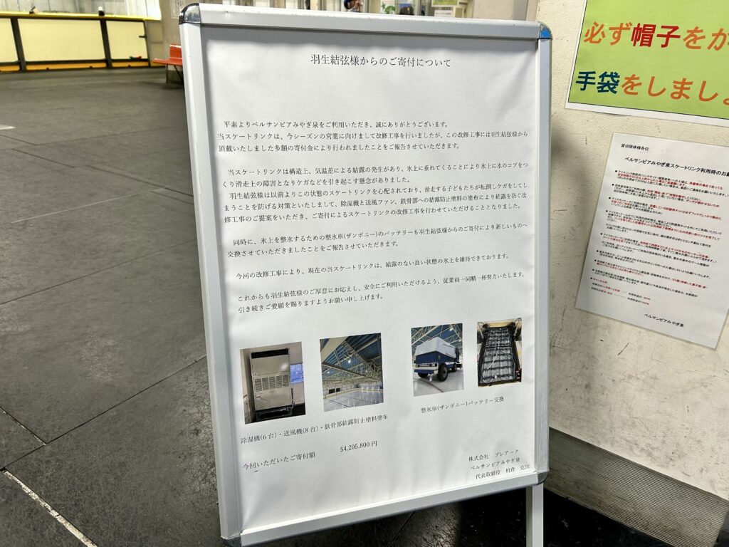 参考:羽生結弦様からのご寄付について | ベルサンピアみやぎ泉