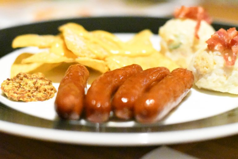 手前から時計回りにチョリソとチーズソースナチョス、それにスモークポテトサラダです。