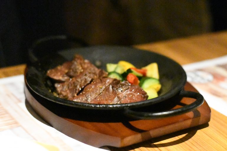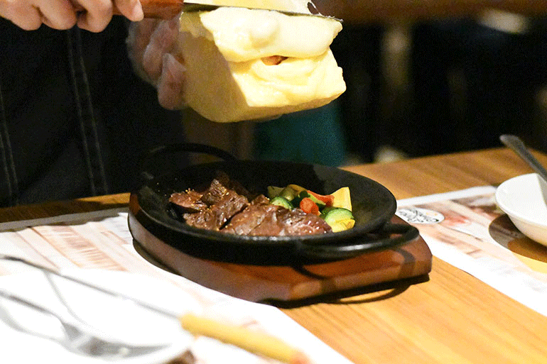 バター醤油で味付けられたハラミステーキにラクレットの美味しさとコクがプラスされて絶品です!これは熱々のうちにチーズをたっぷり絡めていただきました。