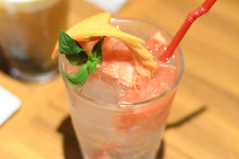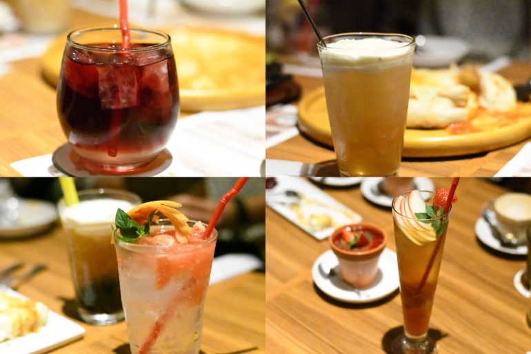 サワー(左下手前)と店員さんのおススメのフルーツティー(右下)フレッシュな果物が添えられていて見た目でテンションもあがります。