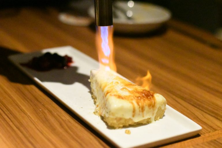 チーズケーキはなんと目の前で炙ってもらえます!表面のお砂糖がキラキラ、とろりと溶け出したチーズとパリッとしたブリュレ、そこにベリーを添えるパラダイス!